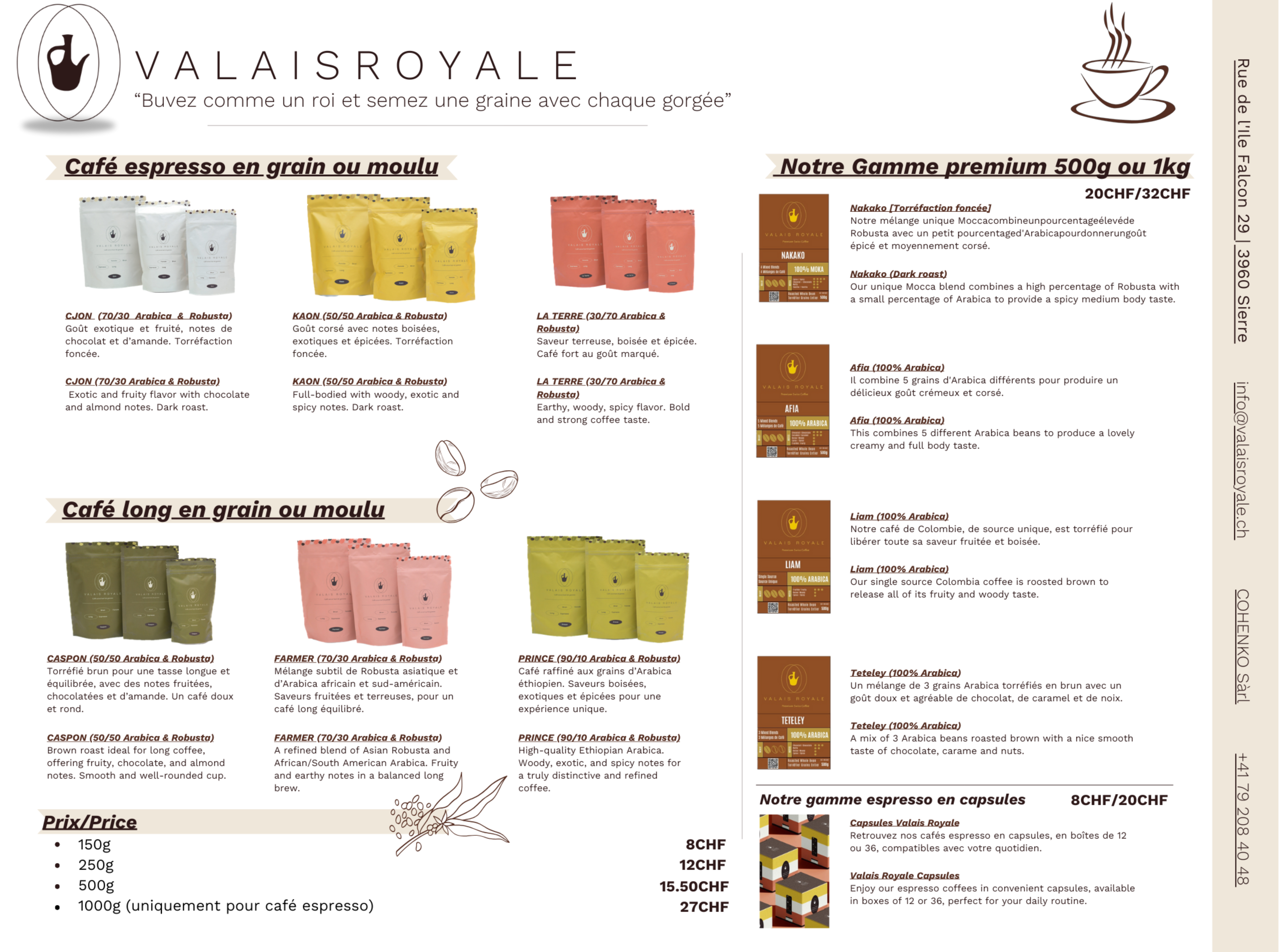 Servez un café torréfié suisse exceptionnel dans votre café, hôtel ou boutique. Explorez nos offres de vente en gros et découvrez comment Valais Royale peut améliorer votre expérience client à chaque tasse.